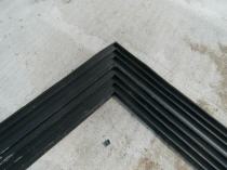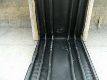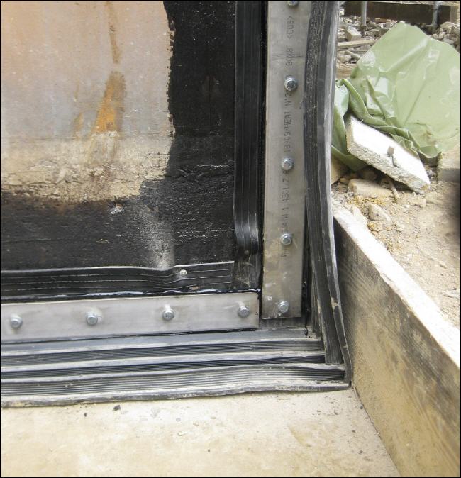 Zur Vorbereitung muss die Fläche gesäubert werden. Unebenheiten und Fehlstellen sind mit einem Spezialmörtel (Kunstharzbasis) auszubessern. Auf dem bestehenden Bauteil wird zuerst ein bituminöser Anstrich aufgebracht. Darauf wird dann ein 10 cm breites Bitumenband auf die bestehende Wand heiß aufgeklebt. Der nächste Arbeitsgang ist das Anbringen des Dehnungsfugenbandes auf das bit. Band im Schweißverfahren. Evtl. anfallende Ecken (s. rechtes Foto) werden örtlich fachgerecht verschweißt und vulkanisiert. Zunächst wird dann auf die V2A-Edelstahlschiene (80 x 8 x 2000 mm) wiederum ein Bitumenband heiß aufgeklebt. Die Bohrungen in der Schiene sind bereits vorhanden. Nun erfolgt die Andübelung der Schiene auf das Dehnungsfugenband an der bestehenden Wand. Die Schiene wird durch die hohe Spannung der Schrauben M 12 so fest auf das Fugenband gedrückt, so dass ein Durchdringen von Feuchtigkeit unmöglich ist. Zur Sicherheit wird die Schiene mit dem Band nochmals erhitzt und die Schrauben nachgespannt.