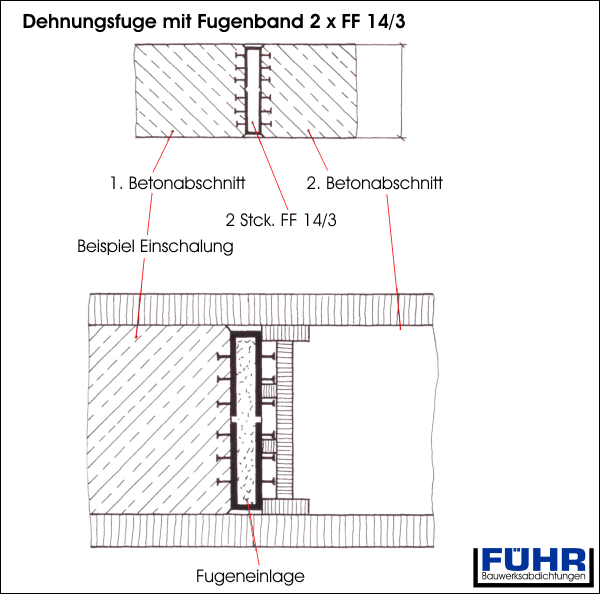 Wir beraten Sie auch beim Einbau von Fugenbändern in Arbeitsfugen oder auch notwendigen Dehnfugen. Vor der Ausführung legen wir zusammen mit dem Statiker notwendige Dehnfugen bei größeren Bauwerken fest. Örtlich bestimmen wir mit dem Bauunternehmer die Arbeitsfugen, die aus Schalungstechnischen Gründen entstehen. |