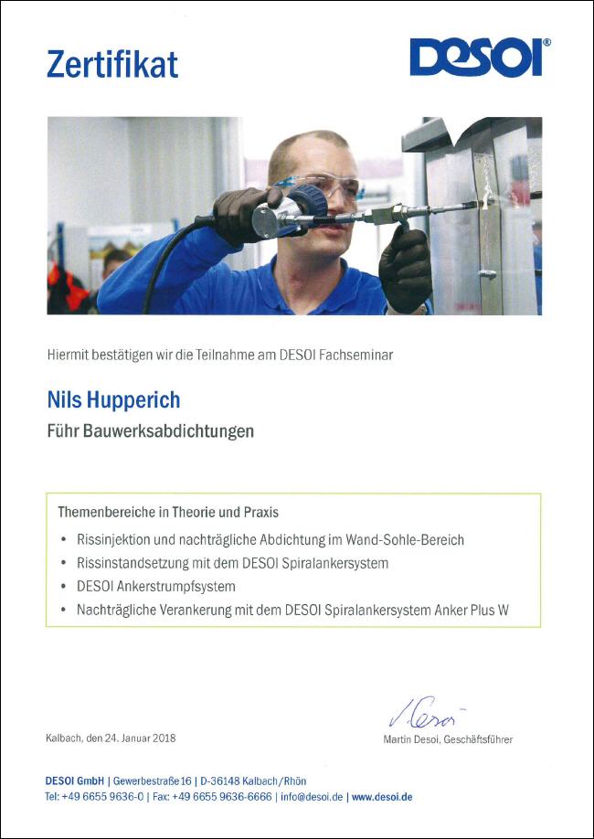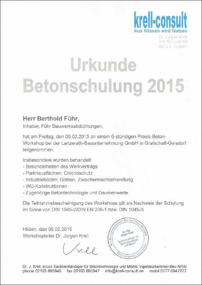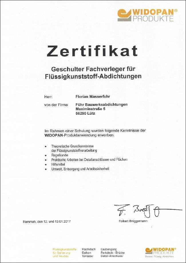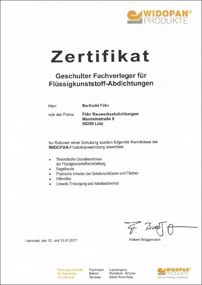 Die Firma Führ Bauwerksabdichtungen ist ein Betrieb, welcher von Berthold Führ, 55 Jahre geleitet wird. Der Firmensitz ist in 56290 Lütz, welches in einem Seitental der Mosel in der Verbandsgemeinde Treis-Karden liegt. |